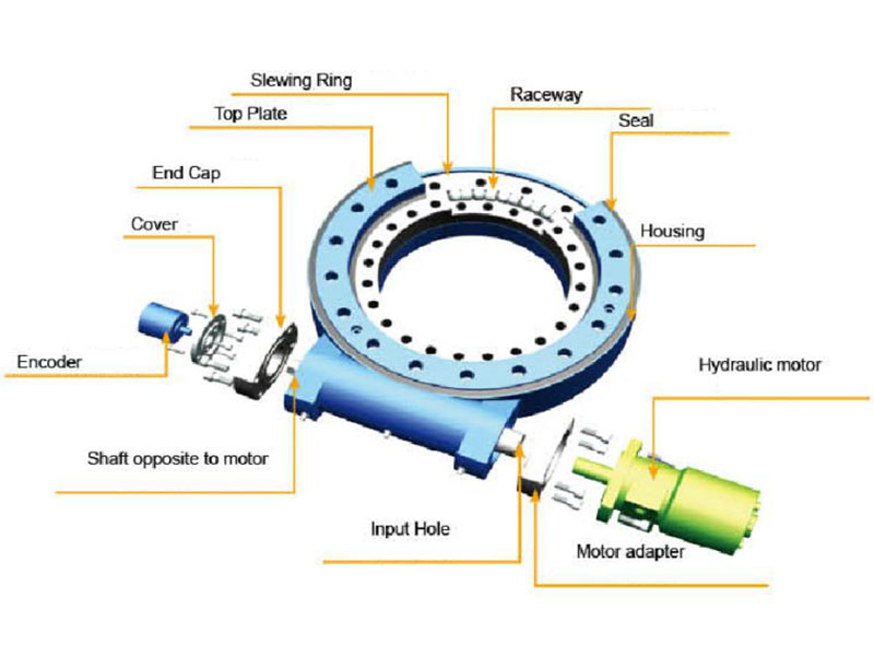 Slew drive often incorporates slewing ring, worm shaft, housing, motor, etc.