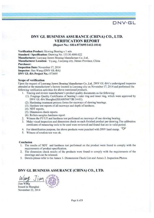 As a high-tech enterprise, our products have passed ISO9001-2000 quality system certification, CCS, ABS, BV, GL and other certifications, and have obtained a number of patent certificates. On request, independent third parties can be invited to monitor the production of your slewing bearings. In addition, project-related tests, inspection and certification from various institutions can be supplied to ensure that the delivered slewing bearings meet your requirements.